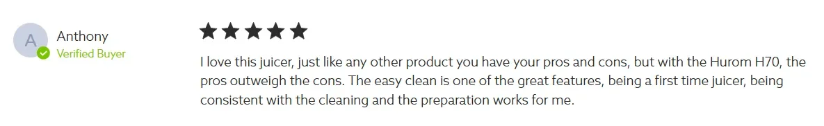 The Hurom H70 juicer enjoys rave reviews from customers. People appreciate its design, juice yield, and especially the ease of cleaning. On the official Hurom store, it has a near-perfect rating of 4.9 stars.